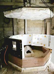 Le four est alimenté par deux brûleurs à gaz Solargil d’une puissance de 58kw. Les brûleurs sont fournis montés sur des trépieds stables en béton, dont la hauteur est réglable de 67 à 104cm. La flamme circule en spirale et est dirigée vers la cheminée située sous la sole (cf plans). La cheminée et la base du four sont maçonnées, les briques sont récupérables avec la vente du four, ainsi que le conduit d’évacuation en inox.